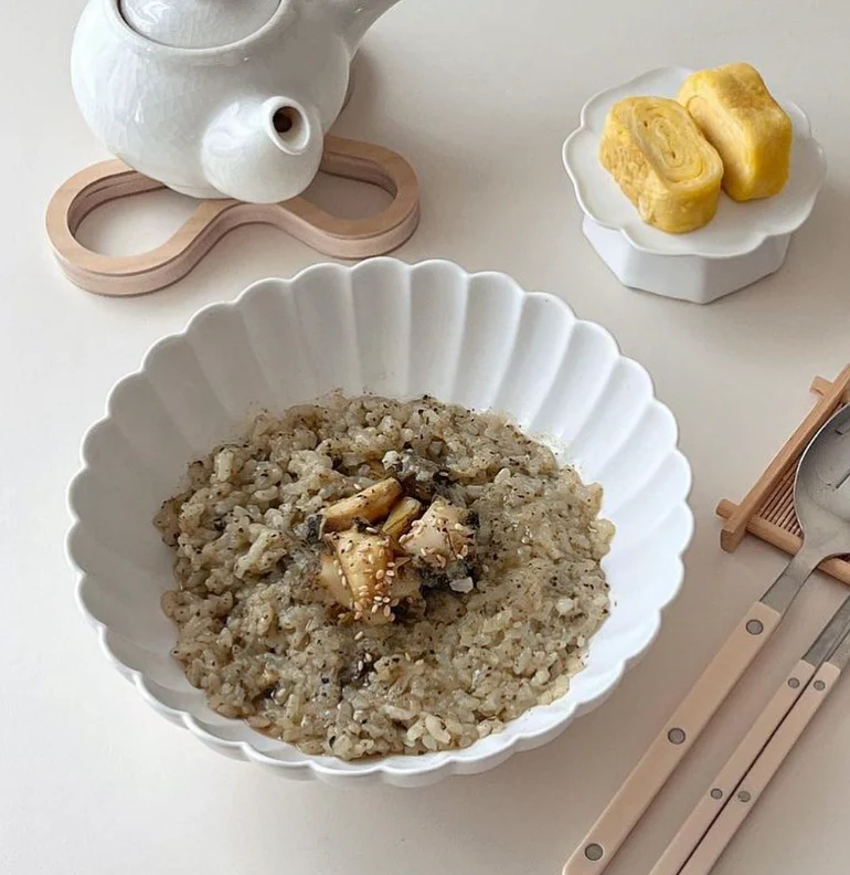 Mujagi bowls are made in Icheon, Gyeonggi-do, which is a representative pottery production area in Korea. The production process of mujagi is simple but special. First, clay is prepared to become the product with high-purity white clay that has been filtered of impurities. Then, it takes shape through the hands of mujagi artisans. After that, it is born as clean pottery through two firing procedures. The pottery by artist Sim Bo-geun, who uses flowers on the roadside as a motif, adds detail to the clear and plain white porcelain, filling the daily tabletop with small happiness.