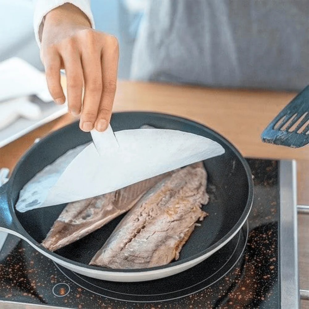 All it takes is one sheet of this paper to keep your kitchen oil splatter-free!ย Just place a sheet of pan cover when cooking meat or fish in your frying pan, and it will soak in the oil droplets and steam that can mess up your cooking area.